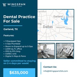 General Dental Practice Garland, Texas FOR SALE $635,000 – General practice established for over 18 years; 3 ops fully equipped, 4 ops plumbed;...