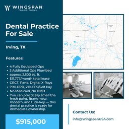 General Dental Practice – Irving, Texas – FOR SALE – $915,000. You can practically smell the fresh paint at this modern,...