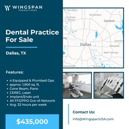General Dental Practice Dallas, Texas FOR SALE $435,000 – General dentistry office with approx. 1,900 sq ft, 4 ops equipped. The office is...