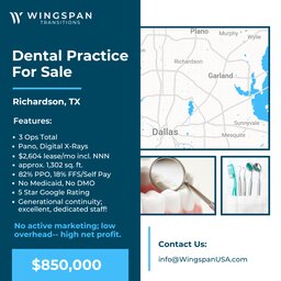 General Dental Practice Richardson, Texas FOR SALE $850,000 – Practice established for over 36 years, 3 ops, approx. 1,302 sq ft, lease is...
