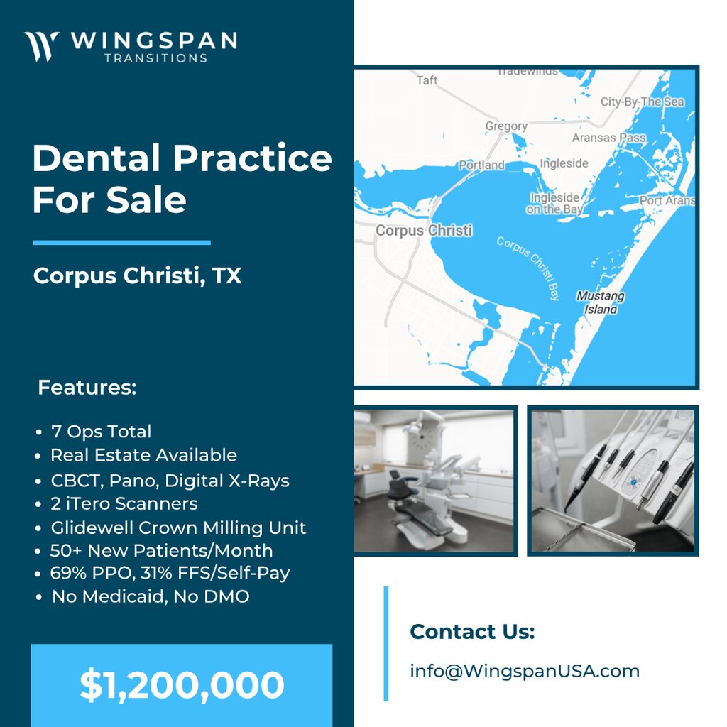 General Dental Practice Corpus Christi, Texas FOR SALE $1,200,000 – Real Estate is available in addition to the practice for $910,000, medical condo, office is approx. 3,232 sq ft, 7 ops equipped. Practice has been established for over 25 years. The office is presently open about 32 hours/week and using Eaglesoft. Technology includes: CBCT, Pano, digital x-rays, Glidewell io (One Day Crown Milling Unit), 2 iTero Scanners, Glidewell printer that makes in-house nightguards and retainers, Casey software, and intraoral cameras; all equipment is in great condition. Patient base about 69% PPO, 31% FFS/Self-Pay, no Medicaid, no DMO with 2600+ active patients and about 50+ new patients/month. Our sellers require a signed NDA before we can share practice details. To get started, simply complete a Buyer Form and NDA at wingspantransitions.com/buyer-form. This only needs to be done once every six months. If you’ve already completed this within that timeframe, just email info@WingspanUSA.com or text us with your name and the listing you're interested in — we’ll verify your profile and NDA are active and send the details your way. Our goal is to respond within one business day. (Listing 1004-SC)