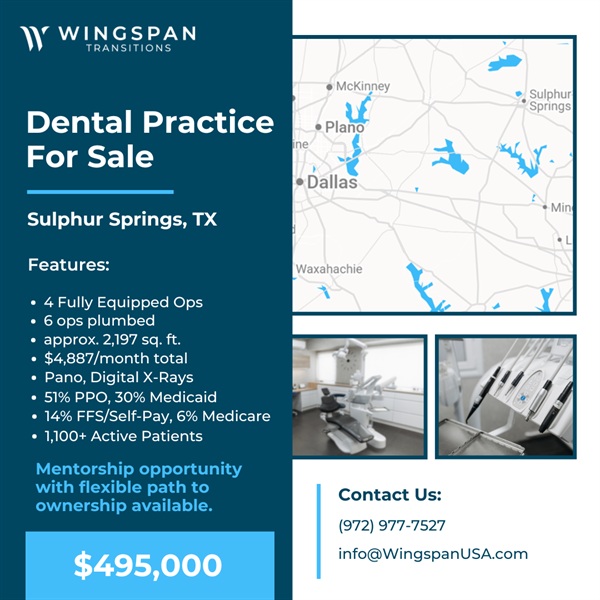 General Dental Practice – Sulphur Springs, Texas FOR SALE $495,000 – This general practice has been serving its community for 12+ years and draws patients from 11 surrounding towns, offering steady demand and regional visibility. The practice is located in a strip-center facility with approximately 2,197 sq. ft., 6 ops plumbed (4 fully equipped), and a lease of $4,887/month total – area observed growth is over 4% in a 3-mile radius! Prime high-visibility location in the heart of the city — constant foot traffic, minimal marketing, and very low overhead. The office is equipped with Pano, digital x-rays, intraoral camera, and Eaglesoft software. All equipment is in excellent condition, and the space offers modern, aesthetic appeal—making it easy for a new owner to step in and start seeing patients immediately. The practice supports a diverse patient base of approximately 1,100 active patients, with a payer mix of 51% PPO, 30% Medicaid, 14% FFS/Self-Pay, and 6% Medicare. This is an ideal opportunity for a dentist seeking mentorship and a pathway to ownership, as the seller is open to creative transition options including seller financing and a potential clinical partnership to ensure a smooth, successful handoff. Our sellers require a signed NDA before we can share practice details. To get started, simply complete a Buyer Form and NDA at wingspantransitions.com/buyer-form. This only needs to be done once every six months. If you’ve already completed this within that timeframe, just email info@WingspanUSA.com or text us with your name and the listing you're interested in — we’ll verify your profile and NDA are active and send the details your way. Our goal is to respond within one business day. Listing 1022-SLO