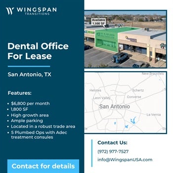 đź’° $6,800/mo | 🏢 1,800 SF | 🦷 5 Plumbed Ops – This 1,800 sq ft dental office in a high-growth San Antonio corridor offers 5 plumbed operatories with Adec treatment consoles, ample parking, and strong surrounding demographics. Positioned in a thriving trade area with major retail anchors, this turnkey opportunity is ideal for a startup, second location, or relocation in one of Texas’ most dynamic markets. Our sellers require a signed NDA before we can share practice details. To get started, simply complete a Buyer Form and NDA at wingspantransitions.com/buyer-form. This only needs to be done once every six months. If you’ve already completed this within that timeframe, just email info@WingspanUSA.com or text us with your name and the listing you're interested in — we’ll verify your profile and NDA are active and send the details your way. Our goal is to respond within one business day.