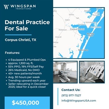 General Dental Practice Corpus Christi, Texas FOR SALE $450,000 -- General practice established for 30 years, with a recent owner for the past 3 years—selling to relocate closer to family. Practice offers 4 ops fully equipped & plumbed located in a strip center with high visibility and close to local economic staples of community employment. The leased office is approx. 1,300 sq. ft. and includes Pano, digital x-rays, and Open Dental. The office is presently averaging 30 hours/week, with a patient base is mostly PPO, with FFS/Self Pay and some Medicaid. Practice stats are trending upward each year with an average of 40+ new patients/month. Want to learn more? Our sellers require a signed NDA before we can share practice details. To get started, simply complete a Buyer Form and NDA at wingspantransitions.com/buyer-form. This only needs to be done once every six months. If you’ve already completed this within that timeframe, just email info@WingspanUSA.com or text us with your name and the listing you're interested in — we’ll verify your profile and NDA are active and send the details your way. Our goal is to respond within one business day. (Listing 1001-AN)