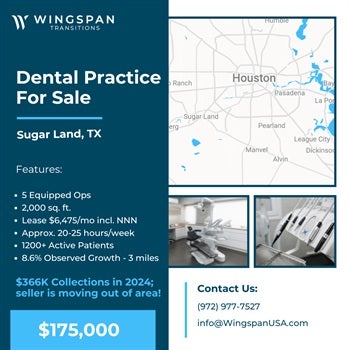 General Dental Practice Sugar Land, Texas FOR SALE $175,000 – General practice established for 11 years; 5 ops fully equipped; lease is currently at a premium for month/month at $6,475 including NNN, approx. 2,000 sq. ft. Located in an office condo in the suburbs of Houston, with 8.6% observed growth within 3 miles, $366K Collections in 2024; seller is moving out of area and is considering all offers! This facility includes Digital X-rays and is presently open 20-25 hours a week on average using OpenDental and XDR software; 1,200+ active patients, 15+ average new patients/month. Our sellers require a signed NDA before we can share practice details. To get started, simply complete a Buyer Form and NDA at wingspantransitions.com/buyer-form. This only needs to be done once every six months. If you’ve already completed this within that timeframe, just email info@WingspanUSA.com or text us with your name and the listing you're interested in — we’ll verify your profile and NDA are active and send the details your way. Our goal is to respond within one business day. (Listing 1009-AN)
