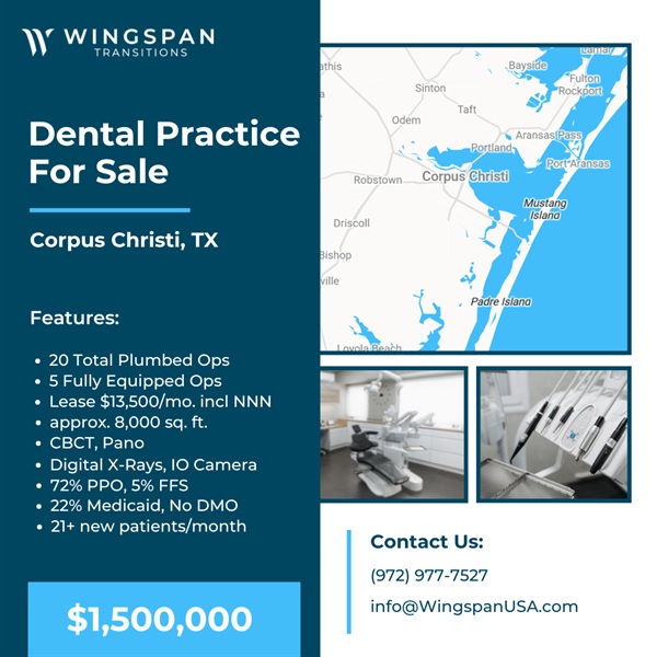 General Dental Practice – Corpus Christi, Texas – FOR SALE – $1,500,000 - Established 9 years, 8,000 sq. ft. facility features 20 total plumbed operatories (5 fully equipped). Technology includes CBCT, Pano, digital X-rays, intraoral camera, and Dentrix software. The lease is $13,500/month including NNN. The payer mix is 72% PPO, 5% FFS, 22% Medicaid, no DMO. New patients average 21+/month, with over 1100 active patients. Our sellers require us to have an NDA on file for anyone we share their info with---thanks in advance! Our sellers require a signed NDA before we can share practice details. To get started, simply complete a Buyer Form and NDA at wingspantransitions.com/buyer-form. This only needs to be done once every six months. If you’ve already completed this within that timeframe, just email info@WingspanUSA.com or text us with your name and the listing you're interested in — we’ll verify your profile and NDA are active and send the details your way. Our goal is to respond within one business day.