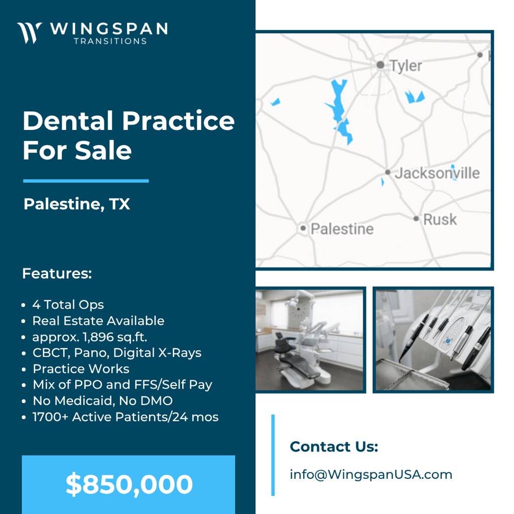 General Dental Practice – Palestine, TX — FOR SALE $850,000 Established for 28 years, this well-rooted general practice offers stability, loyal patient relationships, and meaningful upside. The office features 4 fully equipped operatories with room to expand, and the 1,896 sq. ft. stand-alone facility is available for purchase for $300,000—an ideal setup for an owner who wants long-term control, visibility, and equity. Equipped with CBCT, Pano, Digital X-rays, and Practice Works software, the clinical foundation is strong, efficient, and ready for a seamless transition. The practice maintains a payer mix of PPO and FFS/Cash Pay (no DMO, no Medicaid), with 1700+ active patients over the past 24 months. What makes this opportunity shine is its location: the surrounding 3-mile radius has seen 2.0% observed population growth, drawing a blend of young families, multigenerational households, and long-time residents who value continuity of care. Palestine’s strong sense of community, combined with its steady expansion and small-town charm, creates an environment where a new owner can quickly build trust and momentum. Despite a competitive market, this practice stands out with its reputation, longevity, and turnkey setup—an ideal fit for a doctor ready to step into a thriving East Texas community and make it their own. Our sellers require a signed NDA before we can share practice details. To get started, simply complete a Buyer Form and NDA at wingspantransitions.com/buyer-form. This only needs to be done once every six months. If you’ve already completed this within that timeframe, just email info@WingspanUSA.com or text us with your name and the listing you're interested in — we’ll verify your profile and NDA are active and send the details your way. Our goal is to respond within one business day. (Listing 1052-SLO)