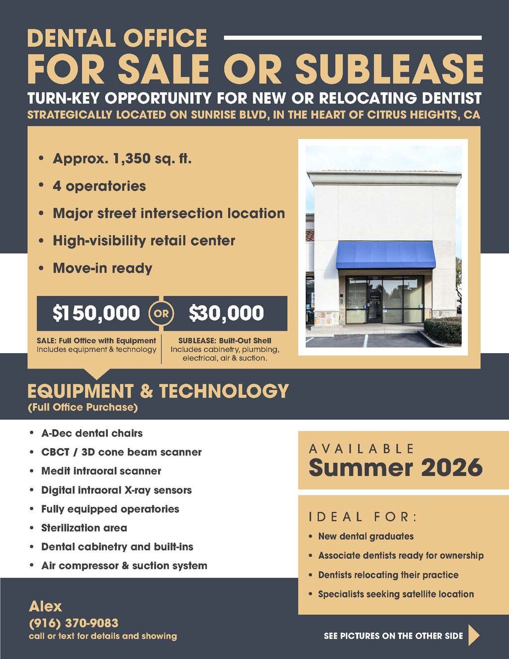 Fully equipped 4-operatory dental office setup available as an asset sale. All equipment is installed and ready to operate. Includes: • NewTom GO CBCT • Digital X-ray system • 4 dental chairs with delivery systems • Compressor and vacuum system • Sterilization equipment • Computers and dental instruments Located in Citrus Heights, CA. on Sunrise Blvd !!!!!!IMPORTANT!!!!!!!! This is an assets-only sale. No patients, no staff, and no goodwill included. Buyer will need to take over the existing lease (subject to landlord approval). Ideal for a new graduate dentist, relocating dentist, or specialist looking for a ready-to-operate office. Purchase Options Option 1: $30,000 – Empty dental office setup Includes cabinets, plumbing, air/compressor, suction/vacuum systems, and existing build-out. Lease takeover required (subject to landlord approval). Option 2: $150,000 – Fully equipped turn-key dental office Includes all dental equipment, 4 operatories, CBCT, X-ray, and everything needed to start operating immediately. Ready to practice day one. Serious inquiries only. Call or text Alex – (916) 370-9083