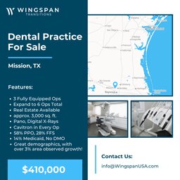 General Dental Practice rural San Antonio, Texas FOR SALE $1,650,000 – Real estate available in addition to the practice for $1.39M. This...