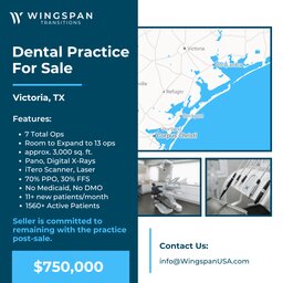 General Dental Practice – Victoria, Texas – FOR SALE – $750,000 – Real estate available in addition to the practice for...