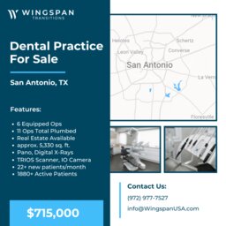 General Dental Practice San Antonio, Texas FOR SALE $715,000 – Real Estate is available in addition to the practice for $1,350,000, stand alone...