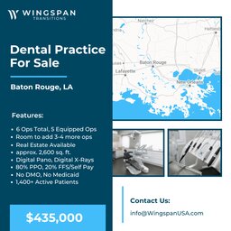 General Dental Practice Baton Rouge, Louisiana FOR SALE $435,000 – One half of the building is owned by the seller; Real Estate is available in...