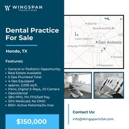 Dental Practice – Hondo, TX — FOR SALE $150,000 A well-positioned practice rooted in a fast-growing, family-driven community. Established...