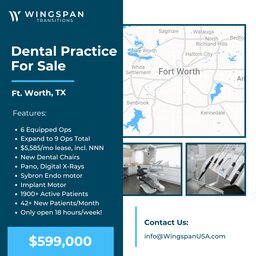 General Dental Practice Ft. Worth, Texas FOR SALE $599,000 -- Collected over $778K in 2024, with almost $747K in 2023 and $763K+ in 2022. General...
