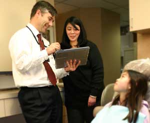 Drawing on MedVisor | dental's™ professionally animated visuals and interactive capabilities, a dentist can discuss implant particulars with a patient in one operatory equipped with a chair-side monitor while down the hall, a dental hygienist can review the art of brushing and flossing teeth with a younger patient and parents. Later, the portable MedVisor | dental ™ can be carried to the operatory or a consulting room via a wireless slate-style tablet. MedVisor | dental is interactive; drawing, notation and highlighting tools are at the dentist's fingertips when most needed.