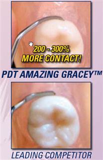 PDT Inc, drastically improved the design of the traditional Gracey blade.  Increasing the contact of blade-to-tooth surface by 200-300%, while minimizing tissue distention significantly.